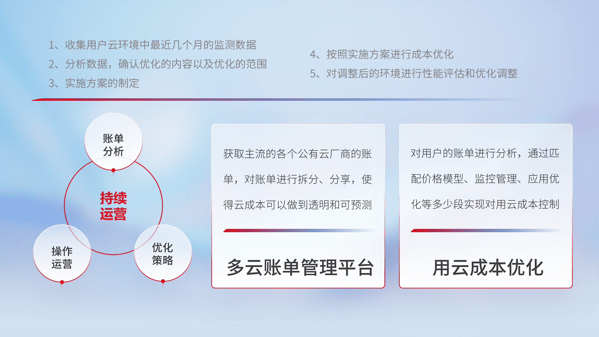 通过多云纳管,,以统一的资源数据模型把客户的云资源进行抽象和封装,,进而实现对多云资源的统一操作,,保障云资源管理的可靠性、、、、稳定性与可用性。。。。量身定制化运维内容,,配置、、、开发运维、、、、补丁管理、、、备份、、、监控、、认证和访问管理、、、、审计和日常巡检等,,,,保障在用云过程中的可靠度,,稳定度以及高可用率。。